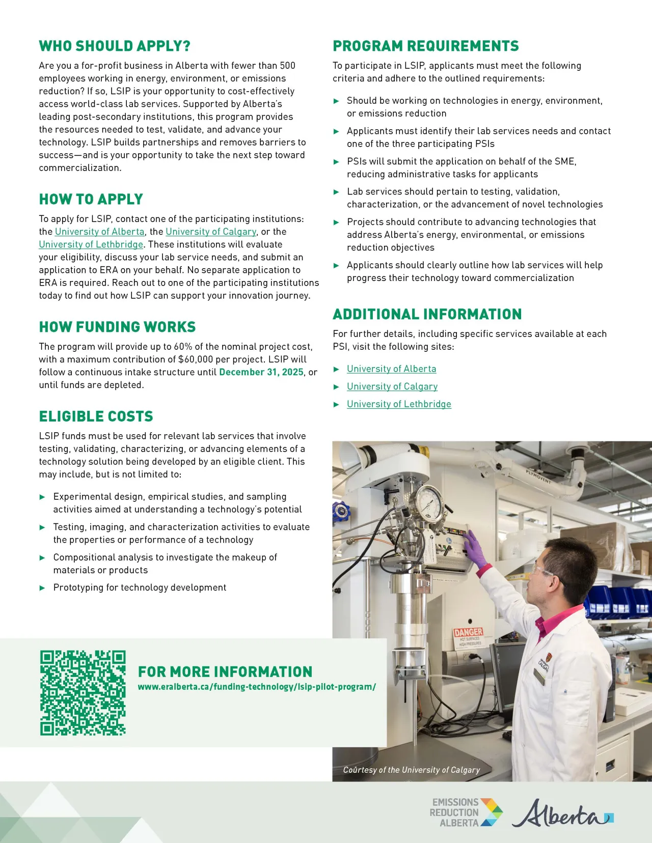 LSIP is the Alberta Laboratory Services Incentive Program created in 2024 to improve collaboration and access to lab services for early stage clean technology developers. The program was created through the Emissions Reduction Alberta (ERA) and is funded from the Government of Alberta's Technology Innovation and Emissions Reductions (TIER) fund.
