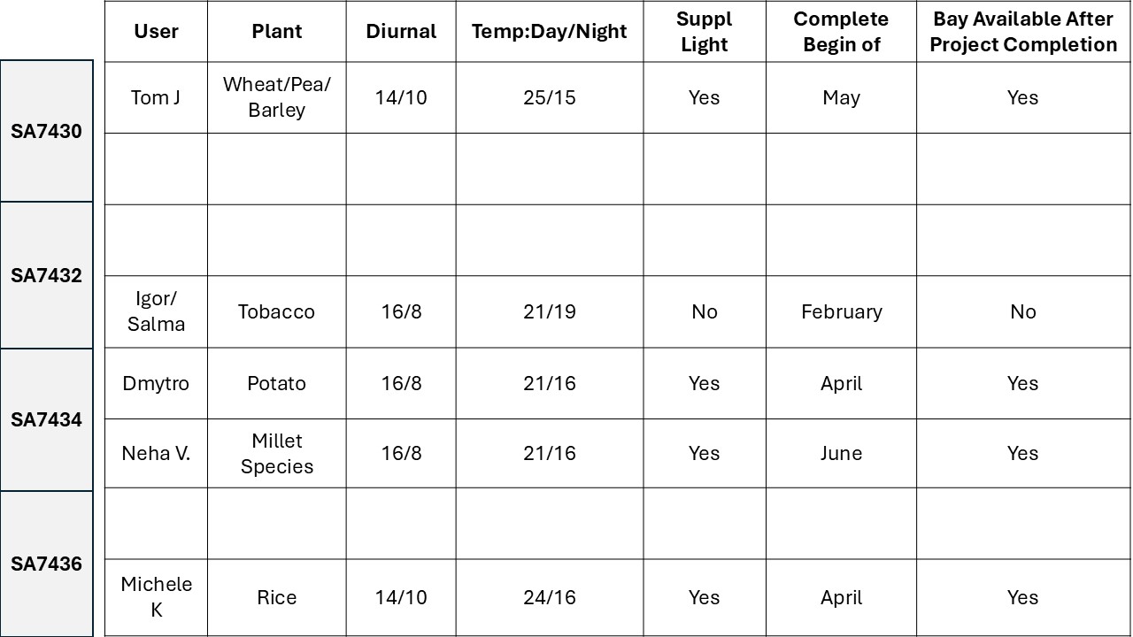 The plant growth facility is available for use to anyone both in the University, and external industry. Researchers are given priority of the space available but industry or academic institutions can use excess space when it becomes available. The facility is managed by staff members.