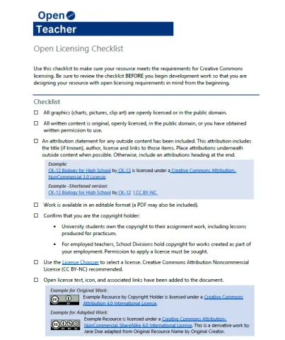“Open Licensing Checklist” is adapted from “Open Licensing Checklist” by Babara Soots, used under CC BY 4.0. Except where otherwise noted, “Open Licensing Checklist” by Kirsten Livingstone and Beth Cormier is licensed under CC BY-NC 4.0.