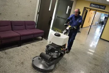 Caretaking worker Derek Vincent put in many hours to make the 40-year-old concrete aggregate floors in the PE building sparkle like new.