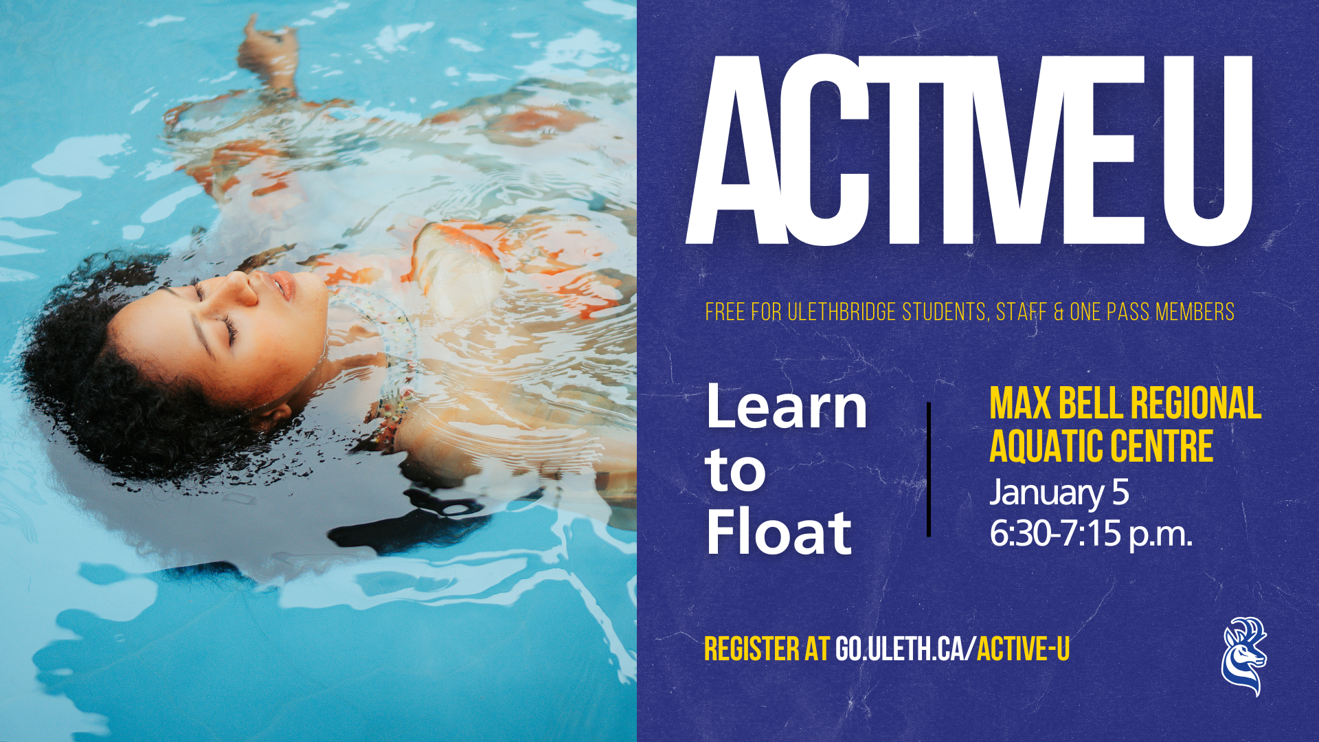 ACTIVE U: Learn to Float Curious about swimming but not sure where to start? Our Learn to Float class is a supportive introduction to the water designed for all comfort levels, even complete beginners. You’ll explore the basics of floating, submersion, and breath control in a calm, encouraging environment. This hands-on session helps you build confidence in the water and prepares you for our full Learn to Swim program. Please note: This FREE event is exclusively for current ULethbridge students, staff, and One Pass members. Monday, January 5, 20256:30- 7:15 p.m.Max Bell Regional Aquatic Centre Register NOW! https://go.uleth.ca/active-u
