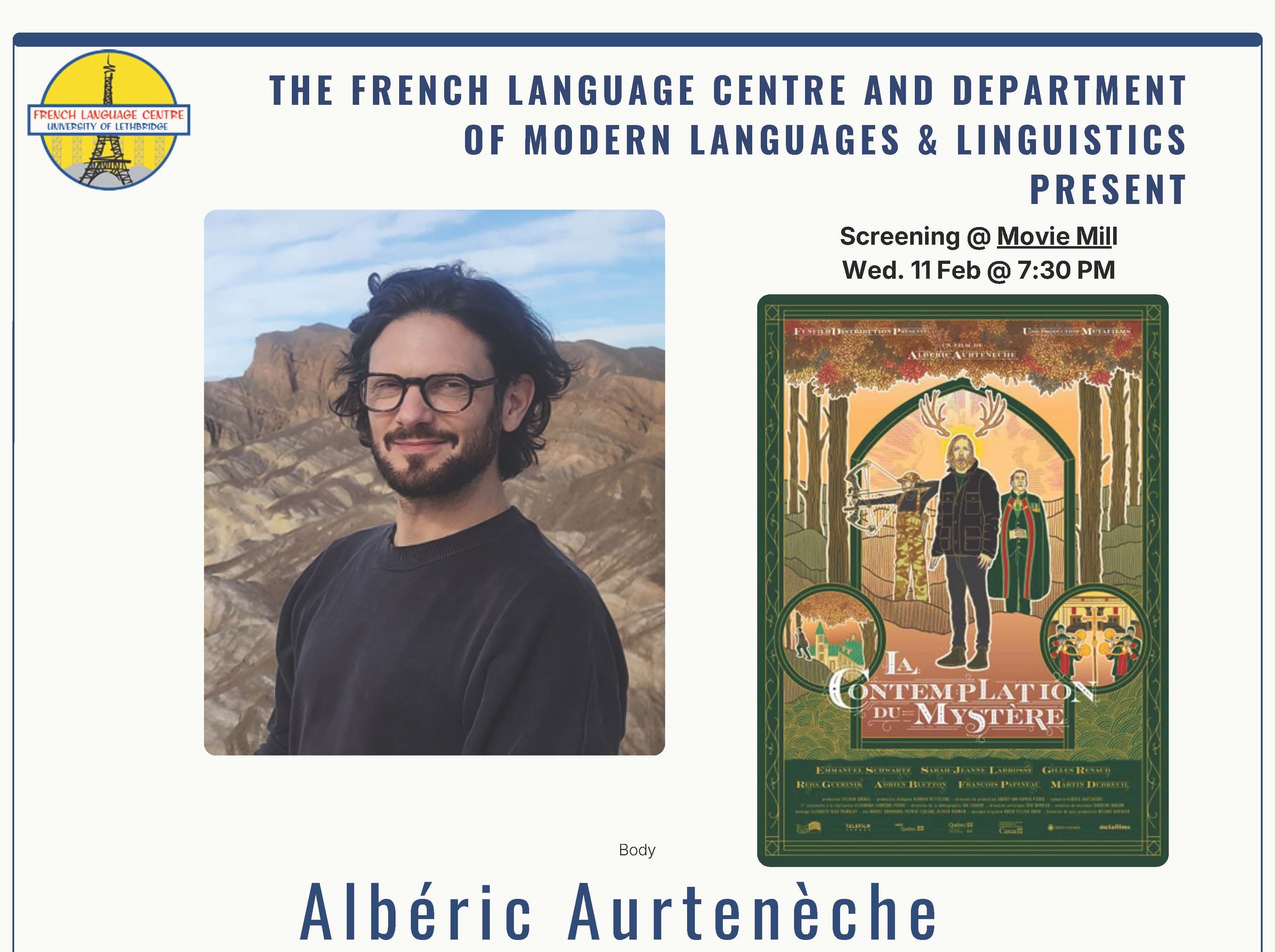 The French Language Centre and the Department of Modern Languages and Linguistics are delighted to welcome Canadian filmmaker Albéric Aurtenèche to Lethbridge and to our University.