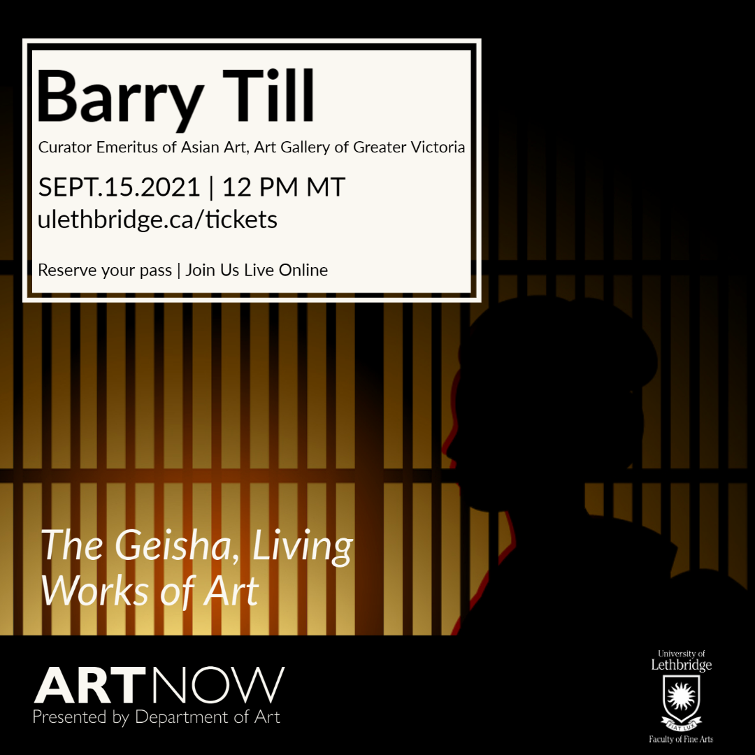 Barry Till, Curator Emeritus of Asian Art at Art Gallery of Greater Victoria, speaks in the first Art NOW of the fall 2021 semester. The talk will focus on geisha in general in Japanese society and in particular, on one of the most successful and influential geishas ever, Ichimaru, as evidenced by her prolific recording career and her beautiful wardrobe in the exhibition, From Geisha to Diva: the Kimono of Ichimaru, on view at the Galt Museum & Archives from September 25, 2021 to January 9, 2022.