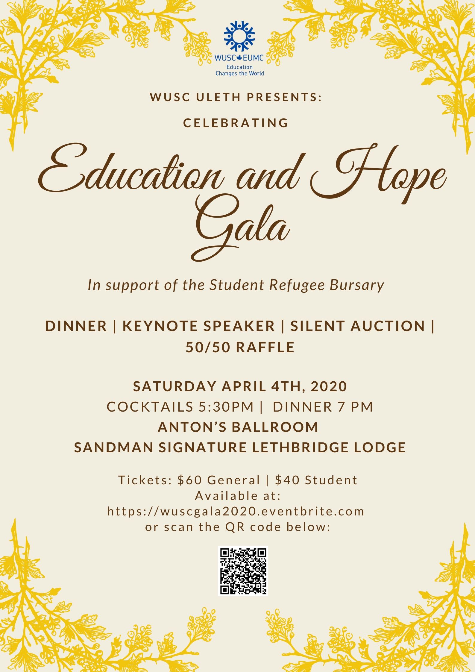 Join us for a great evening as we celebrate education and its impacts on one's life. The event will take place in Anton's Ballroom at the Sandman Signature Lethbridge Lodge. There will be music, silent auction, 50/50 raffle, and a guest speaker. Doors open at 5:30 pm, with dinner served at 7 pm. Proceeds from the gala will go towards the Student Refugee Bursary, aiding continuing students under the Student Refugee Program as they pursue their education at the University of Lethbridge.  Tickets available on EventBrite: https://wuscgala2020.eventbrite.com