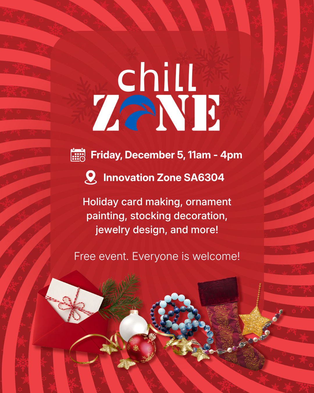 On Friday, Dec. 5 from 11a.m. - 4 p.m. make sure to stop by the Innovation Zone (SA6304) for winter-themed activities and crafts. We'll have everything you need for card crafting, ornament painting, stocking decoration, jewelry designing and more!