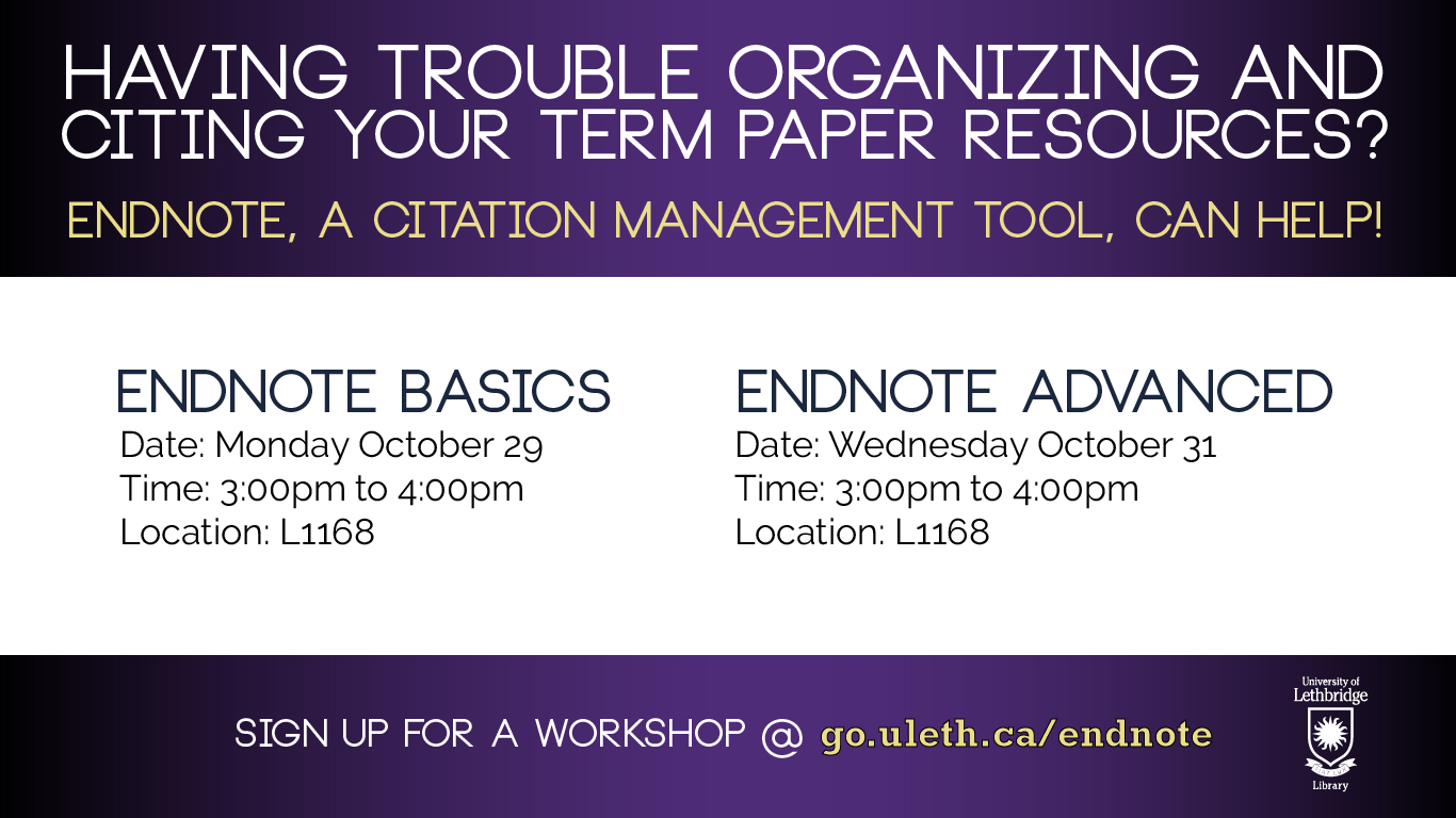 Sign up (https://www.uleth.ca/lib/self-Serve/endnote/) for a Library workshop to learn how to use EndNote effectively.