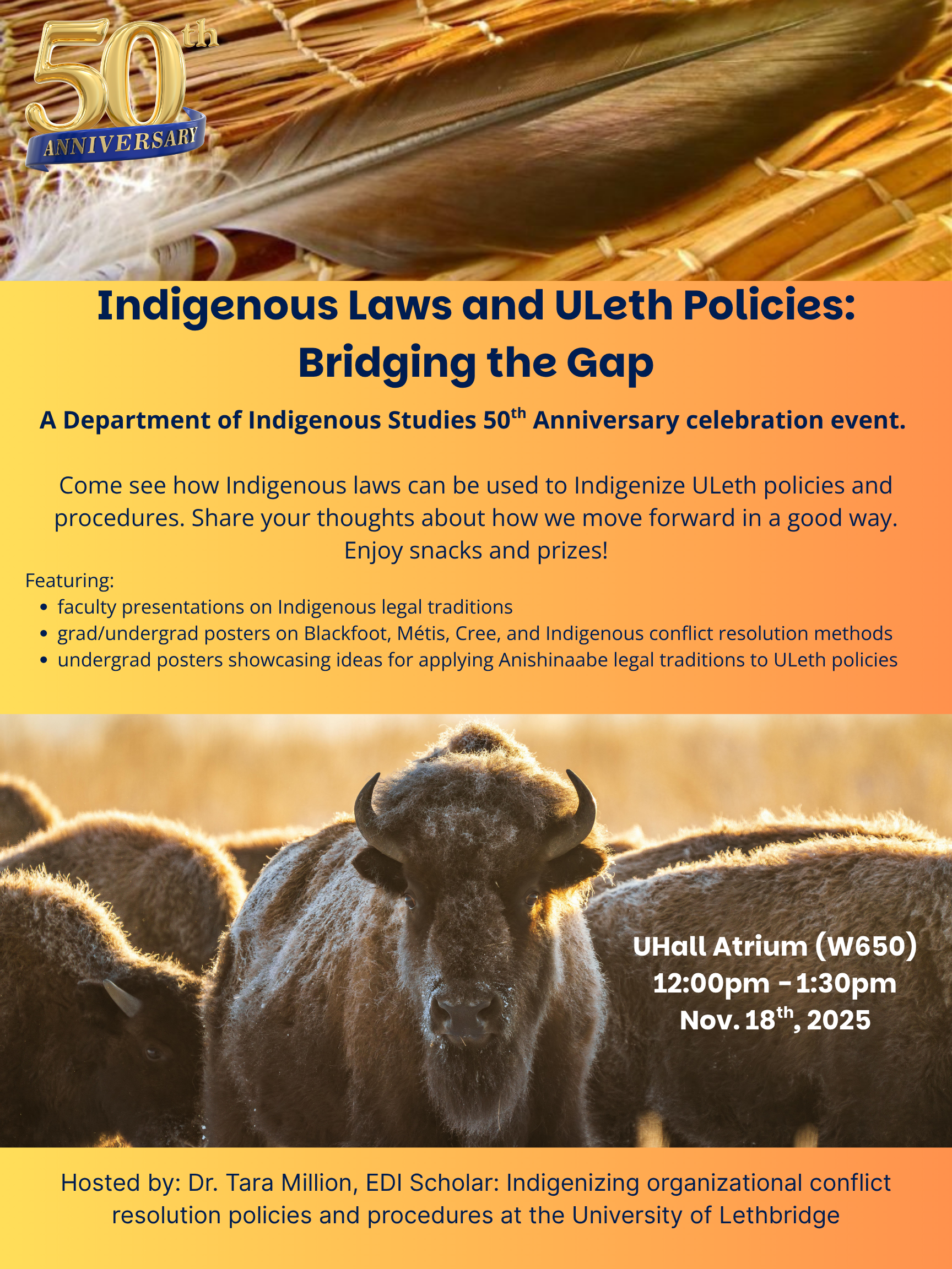 Come see how Indigenous laws can be used to Indigenize ULethbridge policies and procedures. Share your thoughts about how we move forward in a good way. Enjoy snacks and prizes!