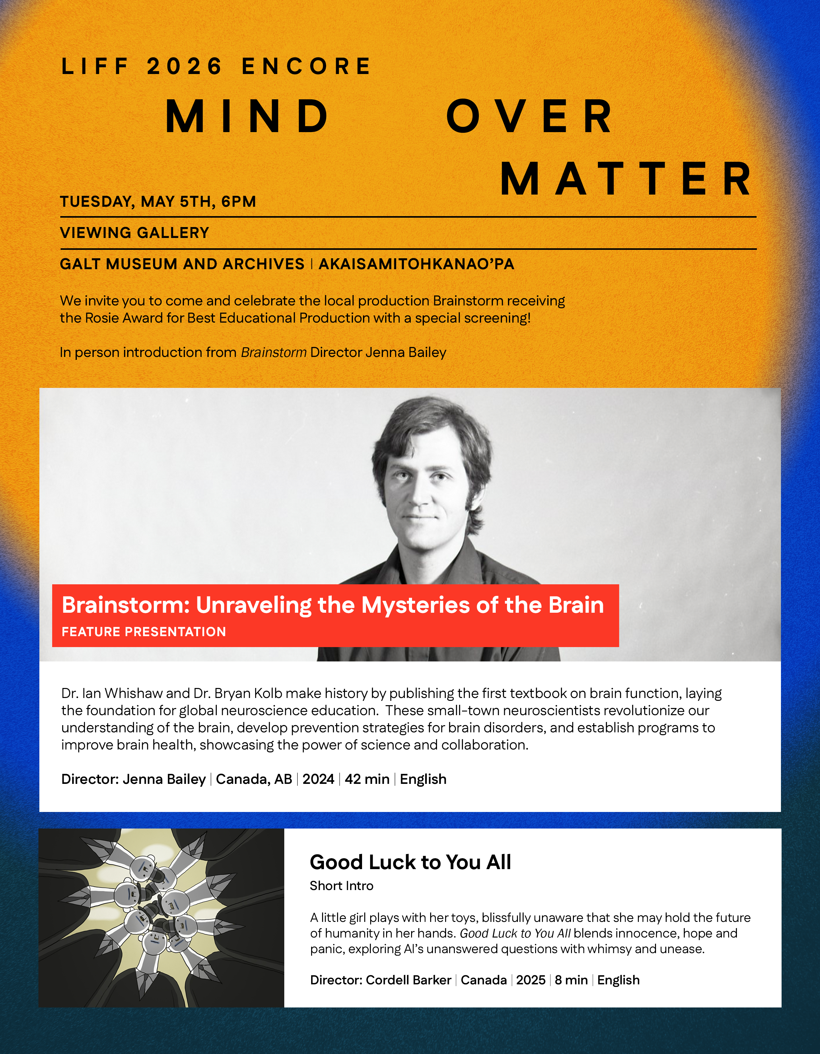 The Lethbridge International Film Festival 2026 presents a special LIFF ENCORE event: Mind Over Matter, celebrating the award-winning local documentary Brainstorm: Unraveling the Mysteries of the Brain.