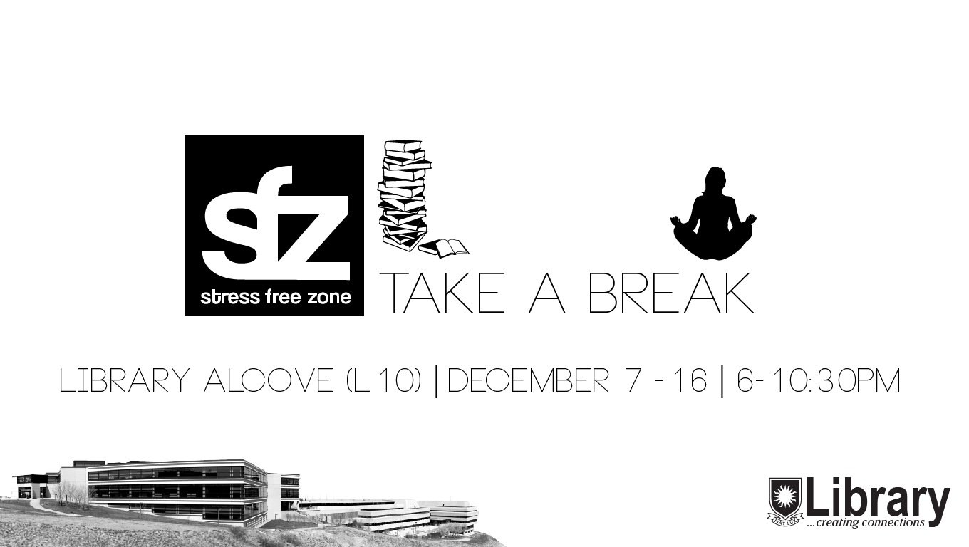 Feeling stressed? Need a study break? Come to the Library's Stress-Free Zone. Relax, enjoy free coffee and snacks, play a game, watch a movie, or just chill out!