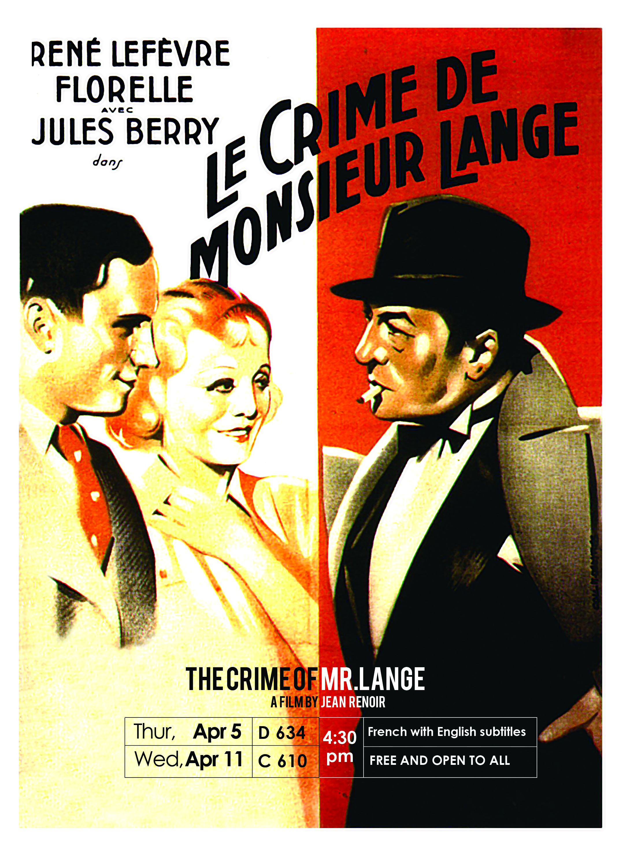 Crime! Film 6: Le crime de Monsieur Lange [The Crime of Mr. Lange] (France, Jean Renoir, 1936). An early Renoir allegory of fighting injustice by any means, at the dawn of WWII. Mr. Lange is a day-dreaming writer of pulp Western fiction; when his unscrupulous boss absconds with their earnings he rallies his colleagues to continue their popular publishing venture. But the boss returns, and Mr. Lange is faced with a dire choice. Screenplay by poet Jacques Prévert. (In French with English subtitles)