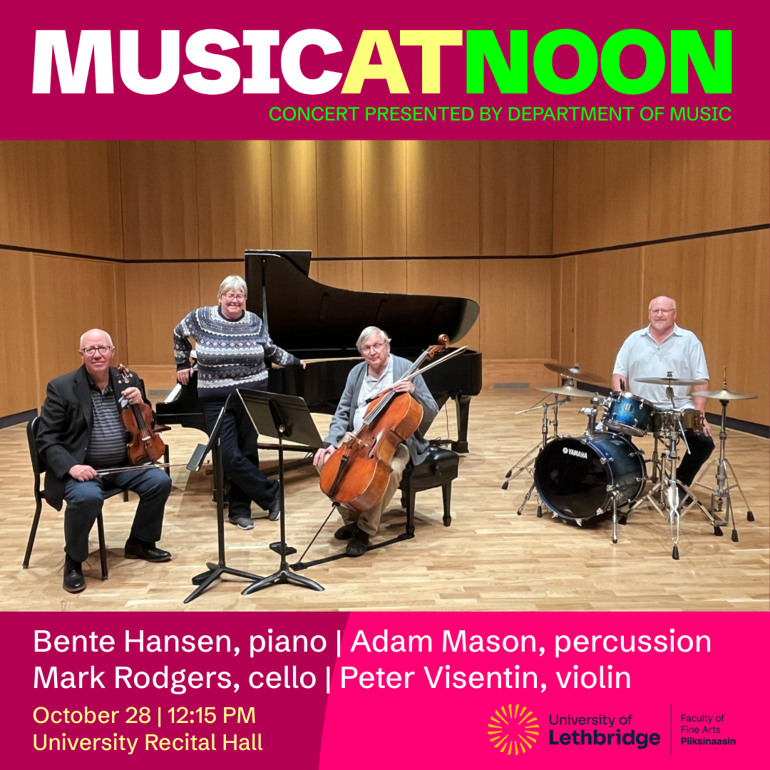 Bente Hansen graduated from the University of Lethbridge in 1986 and went on to receive a Masters of Music in Piano Performance at Michigan State University in 1988. She has worked at the University of Lethbridge since 1997 teaching first year music theory and a plethora of other courses over her 28 year tenure with the Department of Music. Bente has also been quite active with the Drama department as musical director of a number of shows, the last of which was conducting one of her bucket list shows “Jesus Christ Superstar”. She is active as a collaborator, working with a number of undergraduate students. She is also active in the community, offering her talents to senior residences, as well as playing at the hospital on a weekly basis with her good friend Monica. Bente would like to thank Peter, Mark and Adam for joining her on this wonderful recital – we hope you will enjoy listening to it as much as we’ve enjoyed putting it together.