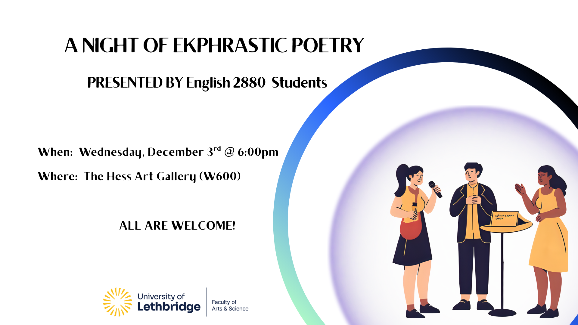 The English 2880 students are presenting A Night of Ekphrastic Poetry. All are welcome to attend, Dec. 3 at 6 p.m. in The Hess Art Gallery (W600).