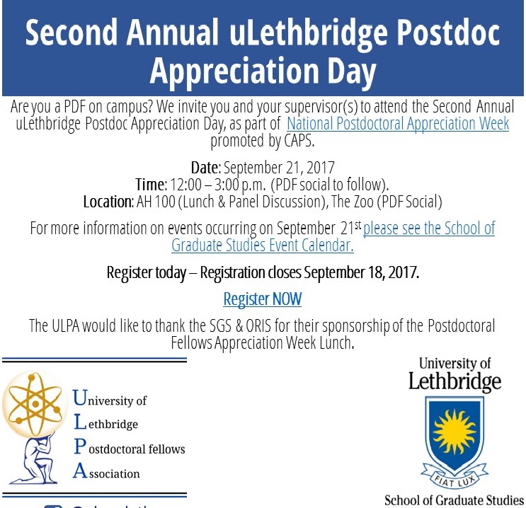 National Postdoctoral Appreciation Week, promoted by Canadian Association of Postdoctoral Scholars (CAPS), takes place September 19-23, 2016. The University of Lethbridge would like to take this opportunity to thank our Postdocs for the many valuable contributions in the areas of research, teaching, and innovation to our campus.
