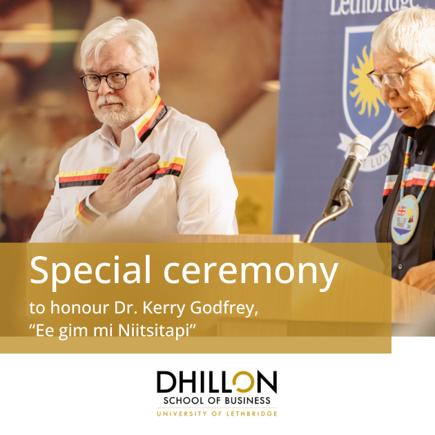 Join us for a special ceremony honouring Dr. Kerry Godfrey, “Ee gim mi Niitsitapi”, dean of the Dhillon School of Business, for his dedication to reconciliation and Indigenization. Lunch for attendees to follow.