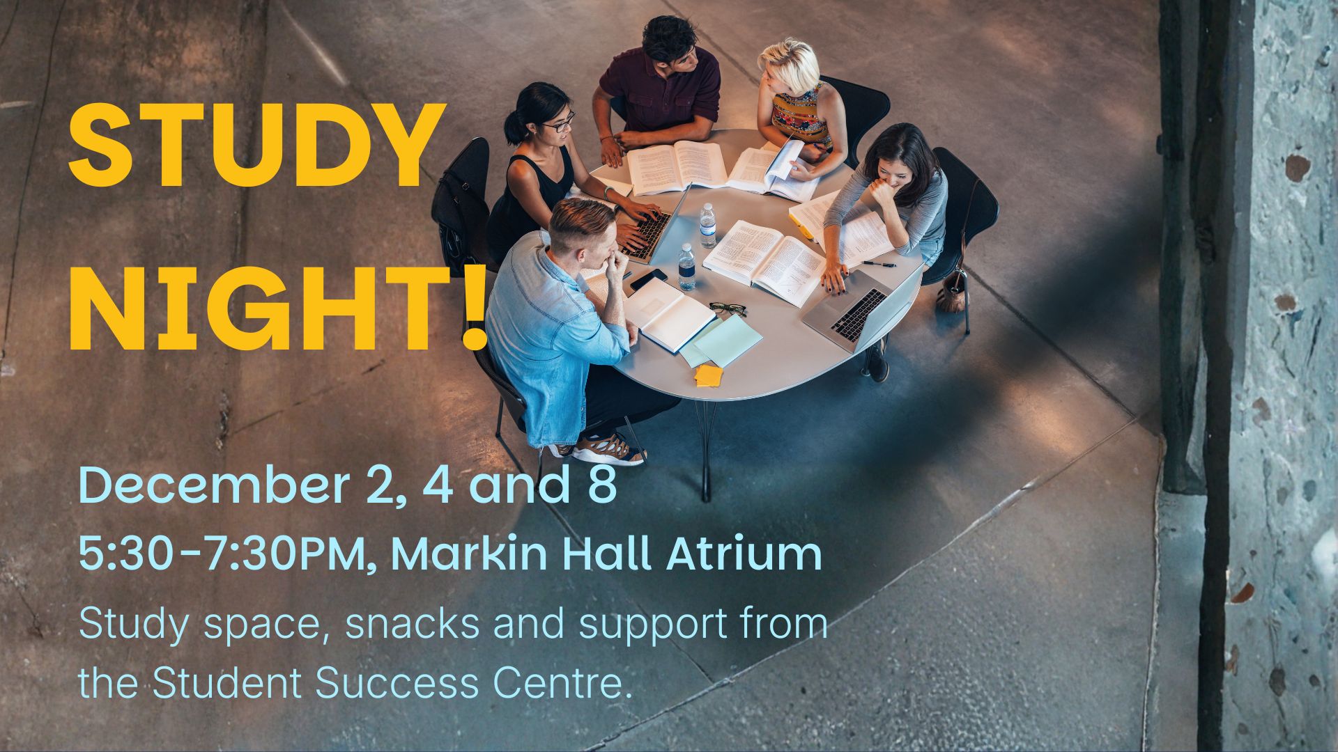The Student Success Centre is hosting three study nights to help you prepare for the end of the semester and final exams. Join us on December 2, 4, and 8 from 5:30–7:30 p.m. in the Markin Hall Atrium for a supportive and productive study environment.