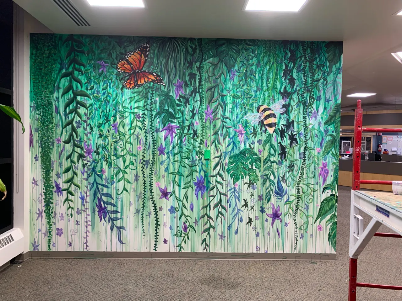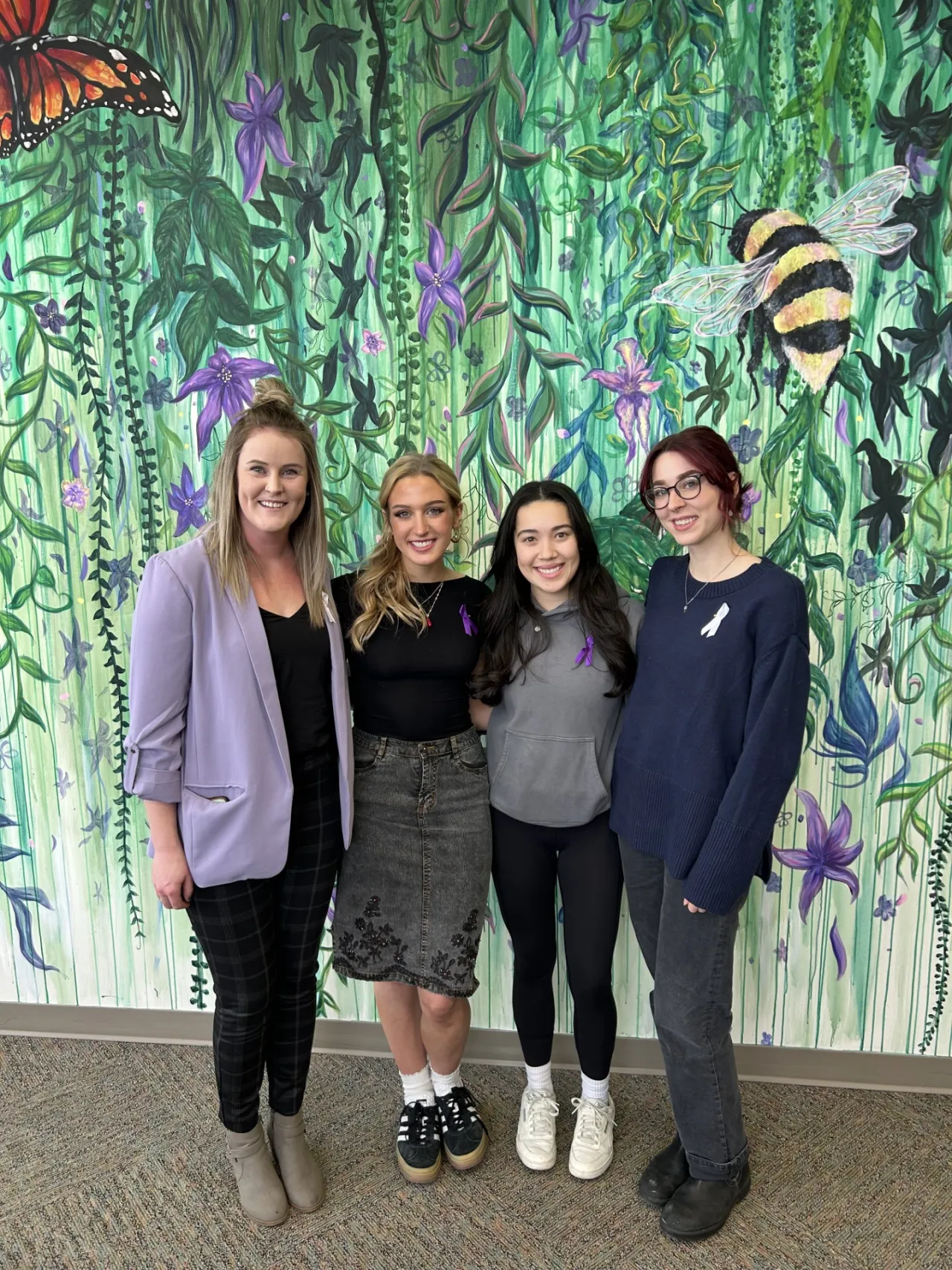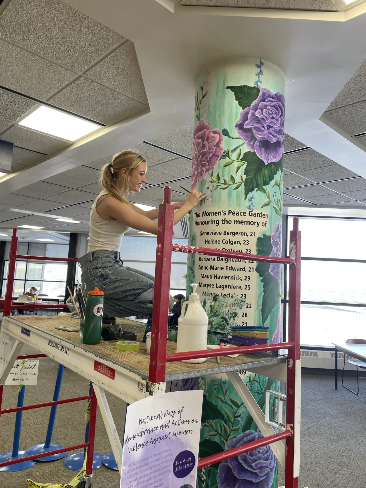 December 6, 2024 marked 35 years since the tragic massacre of 14 women at the Ecole Polytechnique. The University of Lethbridge honors these women with the painting of the Women's Peace Garden Memorial Mural. Creating the Peace Memorial Garden and displaying this tragically beautiful art in the Library demonstrates our commitment to ending gender-based violence on campus and in our community as a whole. The mural was painted by U of L Fine Arts student, Claire Lahey, a SGBVP ambassador. The art creates a narrative honoring these women and educating students to continue to build a safe campus, free from gender-based violence.